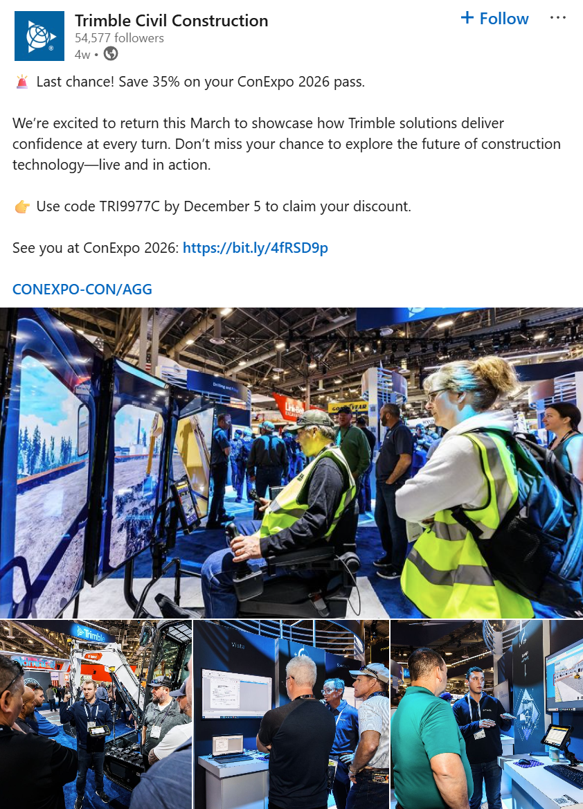 Trimble promoted its codes through social media, directing audiences to the custom landing page from the Exhibitor Marketing Kit.